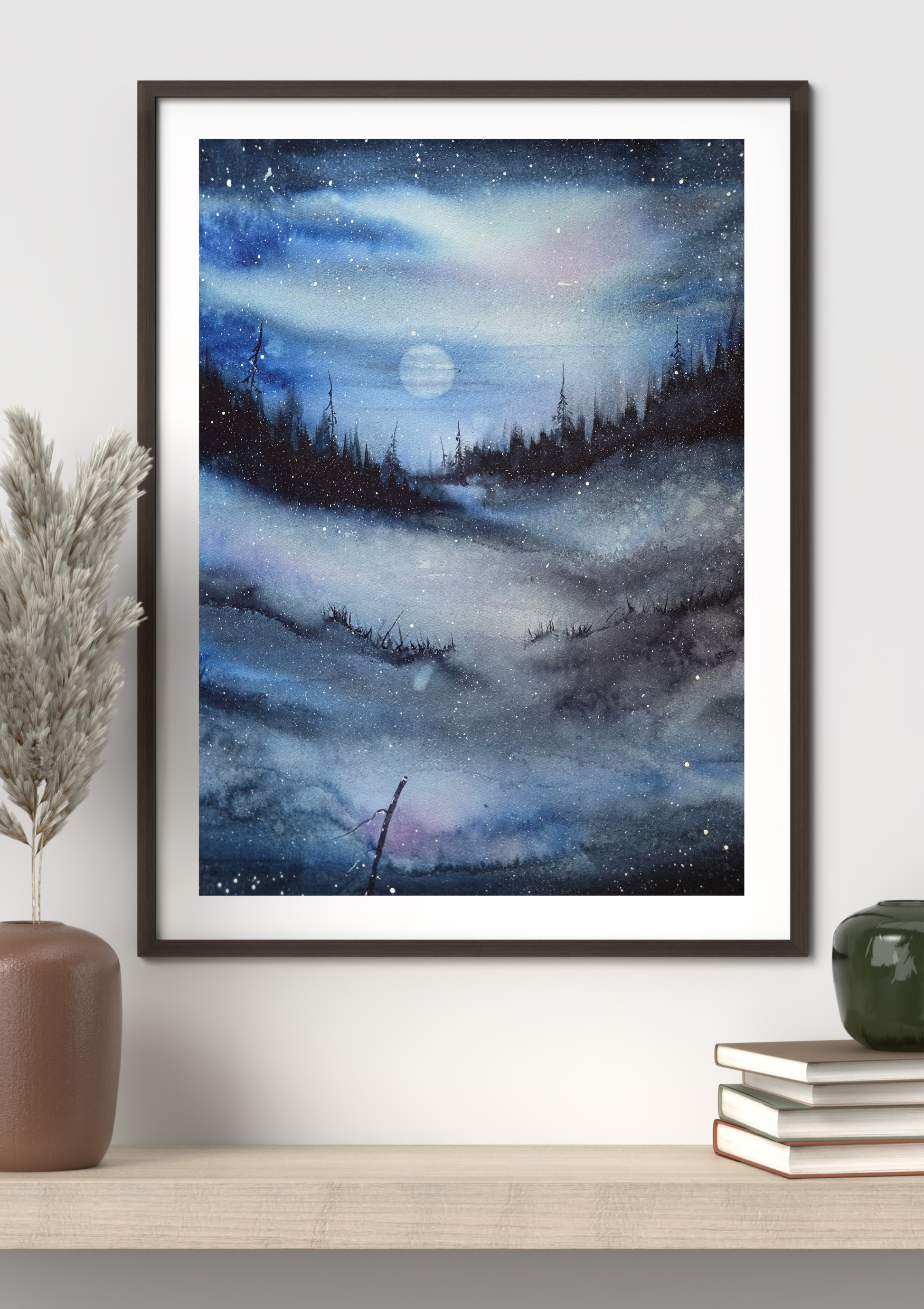 Målningen levereras med vit träram inklusive syrafri passepartout och glas.